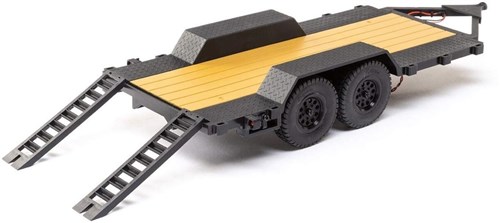 Hitch up the Axial SCX24 Flat Bed Vehicle Trailer to your SCX24 and tow that AX24 crawler to the trail! This is the ultimate functional accessory for 1/24 scale RC rigs - ready to use and complete with hitch, working LED lights, and hide-away ramps.