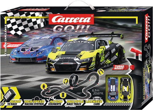 Analog bilbane i skala 1:43 med en Audi R8 LMS GT3 evo II drevet af Moto GP-legenden Valentino Rossi og en Lamborghini Huracan GT3 No.8. Banelængde på 6,3m med krydsende vejbaner, omgangstæller, sløjfe, flere sving, hvoraf det ene er super stejlt! Håndbetjeningerne har trinløst gashåndtag samt turboknap for ekstra fart ved overhaling.