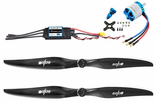 Sunsky X Series combo-pakke! Pakken indeholder 1 stk 2820 860KV motor, 2 stk EOLO 13x7 propeller og en 60A ESC med XT60 batteristik og 3,5 mm guldstik. Opsætning til 1100-1500g 3D-modeller og 1400-2000g sportsmodeller. Leveres med hardware såsom spinner, fastgørelsesskruer og motorophæng. Denne opsætning bruges med 4S LiPo.
