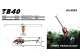 Align T-Rex TB40 er udstyret med et kraftigt drev og to-bladet halerotor, en 3K carbon ramme, en redesignet landingsskid, der er let og holdbar og ikke mindst en justerbar haledrivrem, der er let og utrolig stærk! Batterierne er monteret på en skinne, der glider ind i kulstofhuset, og den medfølgende elektronik følger samme høje standard.