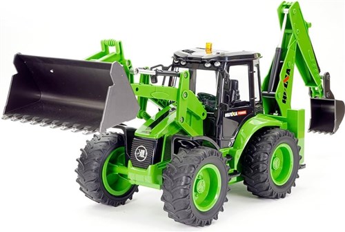 Huina her med en traktor der kører frem, baglæns, højre, venstre, op og ned med skovlene foran og bagved. Den er desuden udstyret med stabilisatorben, lys og lyd. Lige sjovt for voksne og børn. Maskinen leveres komplet med undtagelse af 2 AA batterier til radioen.