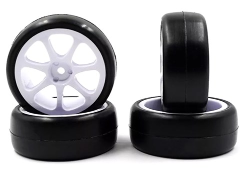 Rush Prelimed Carpet Tires 28CPM - 7 Spoke er et sæt prælimede dæk på en stiv fælg til 1/10 touring på tæppe. Blød og giver et godt greb.