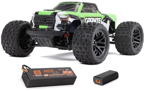 ARRMA Granite Grom Mega, her med børsteopstilling og firehjulstræk. Denne bil kan tåle meget og kan bruges hele året rundt, den leveres med al elektronik færdigmonteret i bilen og en ratradio med god rækkevidde og garanteret fri for forstyrrelser. Bilen leveres med 2s LiPo batteri og USB-C oplader til dette, så her er alt klar til kørsel både på og uden for alfarvej. Bilen kommer med et monster truck karosseri, som nemt klikkes på plads. Denne omfangsrige Granit har også god frihøjde og en kort akselafstand. Bilen har desuden en meget holdbar drivlinje med metal drivaksler og oliefyldte dæmpere.