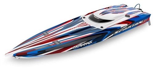 Traxxas her med Spartan-SR! Denne 1m lange båd har en topfart på 80km/t+ og kommer med Traxxas TSM, som hjælper dig med at holde båden stabil. Båden er selvoprettende, kan lave syge backflips og 360 spins for at nævne nogle få. Spartan leveres færdigmonteret med elektronik og radio, du skal bruge, AA batterier, drevbatterier og kompatibel oplader.
