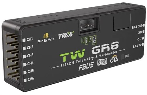 Frsky Twin GR8 er en modtager med Twin-protokol, der også har en black-box-funktion og nogle grundlæggende flydata. Modtageren har 8 indgange og en SBUS-udgang. Med Twin-systemet har du altid to 2,4GHz-antenner, der arbejder sammen, foruden det indbyggede variometer.