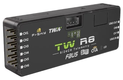 Frsky Twin R8 er en modtager med Twin-protokol, der også har en black-box-funktion og nogle grundlæggende flydata. Modtageren har 8 indgange og SBUS ind og ud port. Med Twin-systemet har du altid to 2,4GHz-antenner, der arbejder sammen.