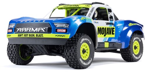 ARRMA Mojave Grom Mega, her med børsteopsætning og firehjulstræk. Denne bil kan tåle meget og kan bruges hele året rundt, den leveres med al elektronik færdigmonteret i bilen og en ratradio med god rækkevidde og garanteret fri for forstyrrelser. Bilen leveres med 2s LiPo batteri og USB-C oplader til dette, så her er alt klar til kørsel både på og uden for alfarvej. Bilen kommer med en buggy krop, som nemt klikkes på plads. Denne robuste Mojave har også god frihøjde, en kort akselafstand og en fører bag rattet. Bilen har desuden en meget holdbar drivlinje med metal drivaksler og oliefyldte dæmpere.