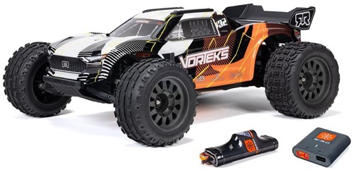 Arrma Vorteks Mega 550, her med børsteopsætning og tohjulstræk. Denne bil kan tåle meget og kan bruges hele året rundt, den leveres med al elektronik færdigmonteret i bilen og en ratradio med god rækkevidde og garanteret fri for forstyrrelser. Bilen kommer med et truggy design, store hjul og et lavt tyngdepunkt, der giver god mobilitet. Bilen har også en meget holdbar drivlinje og spektrum 5 kg styreservo. Leveres med et 8,4V 3300mah batteri og Spektrum S120 USB-C smart oplader.