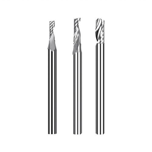 Sættet indeholder 3 fræser lavet af 55 wolframstål og har en klinge (Single fløjte) med en akseldiameter på 3,175 mm