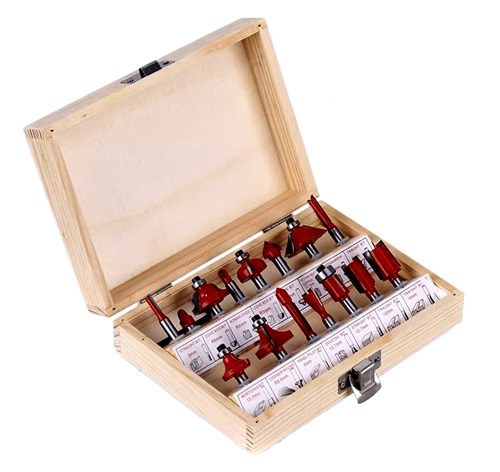 Lige bit - 3 mmLige bit - 6 mmLige bit -12 mmLige bit - 16 mmCore Box Bit - R3,2 mmKernekasse bit - R6,3 mm90° &Quot;V" rillebit - 12,7 mmIndstiksbit - 12,7 mmSvalehalebit - 12,7 mmPanel Pilot Bit - 6,3 mmFlush Trim Bit - 12,7 mmRund over bit - R9,5 mm45° Affasning - 32 mmCove Bit - R6,3 mmRoman Ogee Bit - R4mm