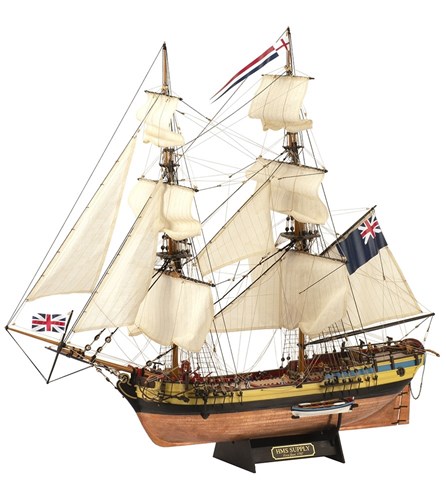 Træmodel af den britiske brigantin fra det 18. århundrede, kendt som HMS Supply. Dette legendariske bevæbnede skib deltog i grundlæggelsen af Australien som en nation ved at etablere en koloni. Det var det hurtigste skib i den berømte First Fleet. Modellen henvender sig til modelbyggere med et mellemliggende færdighedsniveau.