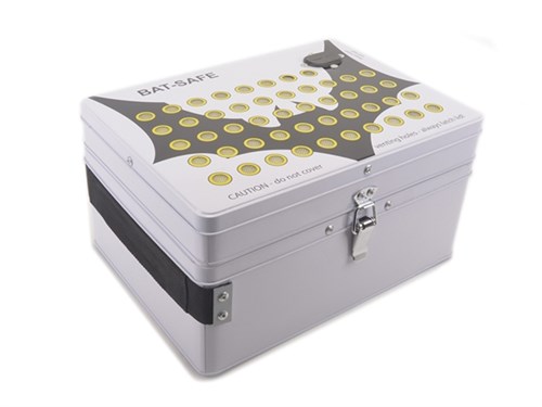BAT-SAFE er en dobbeltvægget isoleret stålkasse med flammespærre. Ethvert batteri inden for specifikationerne vil ikke udgøre en brandfare, hvis det oplades eller opbevares inde i BAT-SAFE.