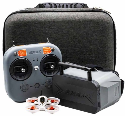 EMAX Nanoscout RTF er en 65 mm 1s indendørs whoopracer! Kommer her som en pakke med alt hvad du skal bruge for at flyve lige ud af kassen, inklusive radio, videobriller, USB oplader til 6 batterier, 1 stk 1s batteri og etui. Dronen kommer med et analogt system og ELRS integreret modtager, der understøtter den medfølgende E8 radio.