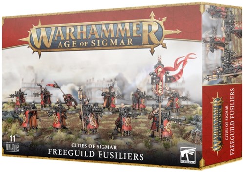 Freeguild Fusiliers er disciplinerede riffelskytter, trænet til at plante deres tunge pavise-skjolde i jorden og danne en forsvarslinje, der fungerer som en fæstningsmur på slagmarken. Dette byggesæt i flere dele giver 10 Freeguild Fusiliers, efterfulgt af en Blackpowder Squire.