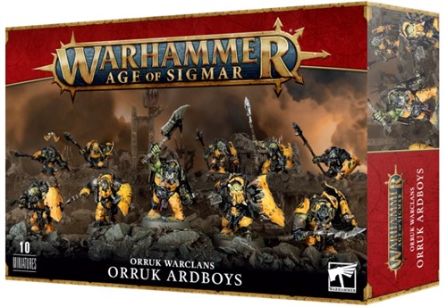 Orruk Ardboyz løber ind i kampen med et vildt brøl og ringen af tunge råjernsplader. Disse hober af voldelige, erfarne krigere river gennem fjendens rækker med en række rå, men skarpe våben og slår både modangreb og uheldige modstandere til side med tunge skjolde.