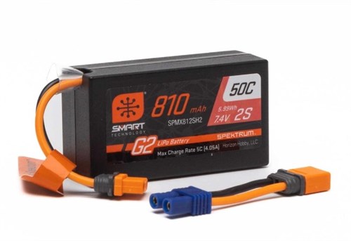 2s LiPo batteri fra Spektrum, batteriet kommer med IC2 stik. Leveres også med en IC2 til EC2 adapter. Batteriet har en række smarte funktioner, der gør det både sikrere og hurtigere at bruge. Batteriet kan også bruges som et traditionelt LiPo-batteri, men det skal oplades med en G2-kompatibel oplader.