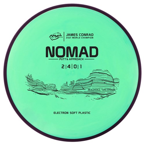 Nomad er en putter designet i samarbejde med verdensmesteren James Conrad. Med et design, der prioriterer kontrol og ligeudgående boldflugt, er Nomad ideel både på greenen og uden for tee. Disken leveres i en tilfældig farve.