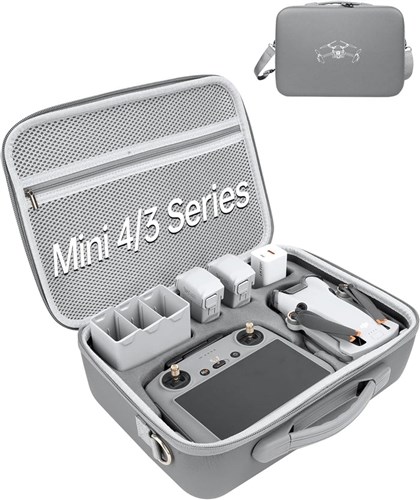 Denne opbevarings- og rejsetaske rummer DJI Mini 3/Mini 4 Pro/Mini 3 Pro og tilbehør, inklusive dronen. Kassen er grå og har en ru PU-stofoverflade.