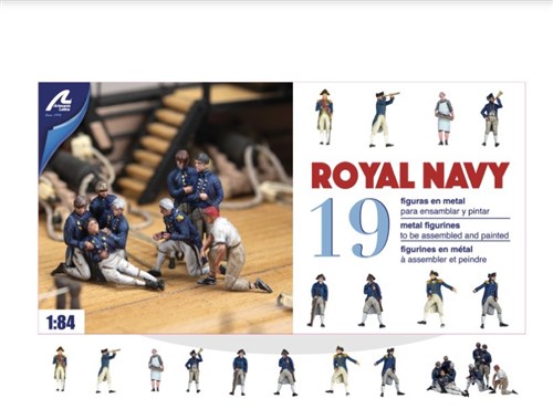 Sæt med 19 metalfigurer i skala 1:84, til samling og maling, tilpasset træskibsmodeller fra den britiske flåde, såsom linjeskibet HMS Victory. Figurerne passer også perfekt til andre marinemodeller i samme skala og æra, det 18. århundrede og begyndelsen af det 19. århundrede. Hver figur måler cirka 20 mm.