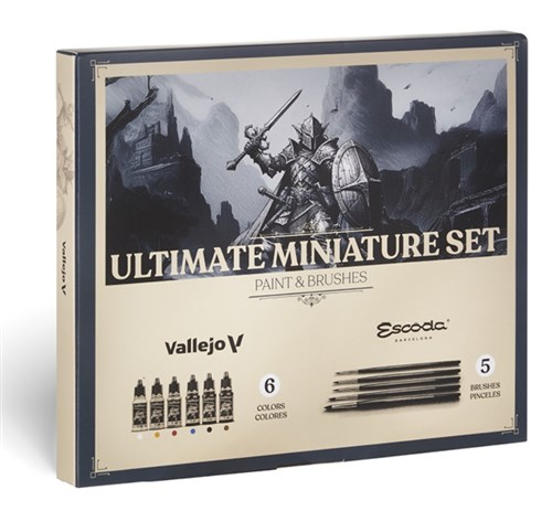 Vallejo Game Color Ultimate Miniature Set - Maling & Pensler, indeholder et udvalg af 6 farver og 5 pensler. Designet til at introducere dig til den spændende verden af miniaturemaleri. Vallejo Game Color er perfekt til at male fantasy- og krigsspilsfigurer.
