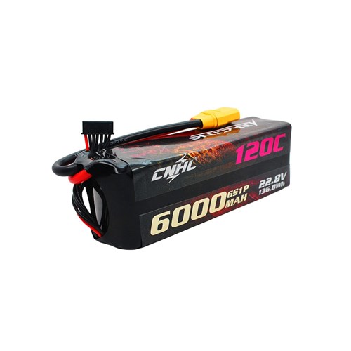 6s 6000mAh -120C - CNHL. Dimensionerne er 138x48x46mm og er perfekte til at køre biler, der kræver meget strøm og kapacitet. Leveres med XT90-stik og 120C-klassificering. Batteriet er af HV-typen (22,8V).