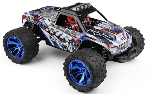 Denne monstertruck i skala 1/14 tilbyder en god balance mellem størrelse og vægt. Karosseriet leveres med LED-lys, hvilket gør denne monstertruck endnu mere fantastisk at køre. Hastighed og venderadius er trinløst justerbar, og med 2,4 GHz radiosystemet kan flere personer køre på samme tid uden forstyrrelser. Modellen er også udstyret med en køleventilator til ESC'en og en køleplade på motoren.