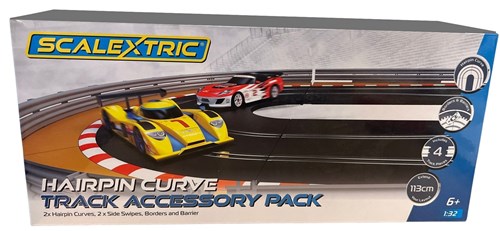 Scalextric C8195 - Harpin Curves tilbehørspakke) til Scalextric 1:32 bilbaner. Denne udvidelsespakke giver dig mulighed for at tilføje 2x Hairpin Radius 90 graders kurvebane og 2x 350 mm sidelæns bane, som passer perfekt til både standard og digitale Scalextric-bane. Uanset om du bygger en simpel bane eller en større bane, giver R2-kurverne mere variation og fartglæde.
