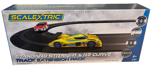 Scalextric C8198 - Standard lige spor og R2-kurve til Scalextric 1:32 bilbane. Denne udvidelsespakke giver dig mulighed for at tilføje 4x Radius 2 45º kurve og 4x 350 mm lige spor, der passer perfekt til både standard og digitale Scalextric-baneanlæg. Uanset om du bygger en simpel bane eller en større bane, giver R2-kurverne mere variation og fart og sjov.