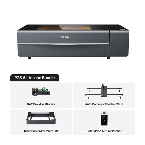 Alt-i-en-pakke indeholdende xTool P2S CO2-laser, RA2 roterende tilbehør til gravering på cylinder- eller runde objekter, hævebase til at hæve maskinen til større og højere objekter, transportbåndsføder til fremføring af længere objekter og brandsikkerhedssæt.