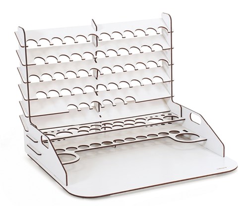 Vallejo malerstativ - Malerstativ 40x30 cm med lodret stativ. Den perfekte løsning til opbevaring af Vallejo-farver. Denne model rummer 76 flasker Vallejo-farver à 18 ml, sammen med 4 flasker à enten 35 ml eller 60 ml, 2 flasker à 200 ml og 10 pensler. Nem montering, der ikke kræver lim.