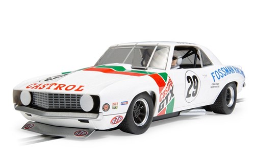 Scalextric Chevrolet Camaro - Castrol Racing Trans Am 1971. Dette er en banebil i skala 1:32 og er beregnet til brug på Scalextric analoge 1:32 baner eller lignende banesystemer. Bilen kan konverteres digitalt ved hjælp af et digitalt stik. Bilen leveres i en flot æske med et udstillingsværdigt design.
