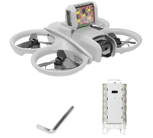 DJI Neo Pro Tactical Spotlight Kit fra Firehouse er designet til DJI NEO. Kittet består af en topmonteret, helt fritstående lygte, der kan justeres fremad eller vinkles opad for strobelys under natflyvninger efter behov. Lygten er af ARC V-typen og giver hvidt strobelys. Den leveres også med en LED-lygte til understellet. Denne er specielt designet til forhold med svagt lys under 15 lux og giver effektiv belysning for at forbedre DJI Neos flyvestabilitet. Det 10 mm hævede kabinet beskytter også batteriet og reducerer stød ved landing, hvilket sikrer sikrere og mere pålidelige natflyvninger. Opladningskabler medfølger.