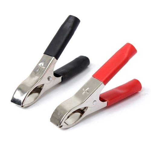 Store krokodilleklemmer. Leveres som et par med en rød og en sort.