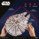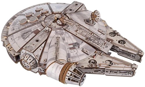 Komplet model bestående af laserskårne træpaneler, der i et kompositmateriale genskaber den ikoniske Millennium Falcon. Modellen inkluderer et udtrækkeligt tag, detaljeret interiør, bevægelige lastdøre, rampe, kanontårn og en roterende 360° antenne. Batteridrevne LED-lys simulerer hyperdrive-motorerne, mens farvede elementer og fiberplader med høj densitet giver både visuel autenticitet og styrke. Dette er et avanceret byggesæt, og færdigheder er påkrævet. Sættet består af 1235 dele, ingen specialværktøjer eller lim er påkrævet.