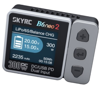 SkyRC med en oplader så kompakt, at den passer i lommen, B6 Neo 2! Denne oplader har mulighed for at oplade med 300W (DC) med en maksimal spænding på 15A! B6 Neo 2 har XT60 DC-indgang og Type-C PD (80W), hvilket giver dig stor fleksibilitet! Derudover er opladeren en batteritjekker, der tjekker LiPo-, LiHV-, LiFe- og LiIon-batterier. Alle data vises på farveskærmen og styres nemt via kun tre knapper!