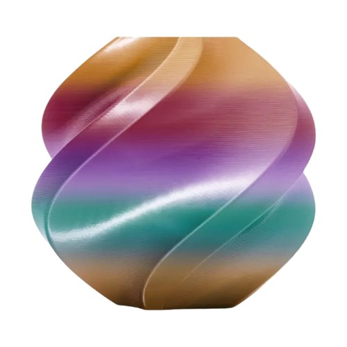 Silk Dual ColorImponerende tofarvede effekter med Bambu Lab PLA Silk Dual Color. Hver tråd består af to omhyggeligt udvalgte farvetoner, der er smeltet sammen til ét filament. Når det færdige objekt roteres, skifter farven problemfrit mellem de to nuancer.