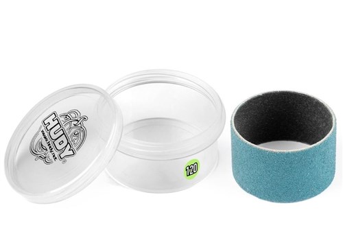 HUDY Professional Alu Sanding Drum with P120 Grain - Medium. Ekstra sliptrommel i P120 middels korning for bruk med HUDY Professional Alu Sanding Drum #102580. Gir rask materialfjerning ved grovere tilpasninger og leveres i egen praktisk plastboks for trygg oppbevaring.