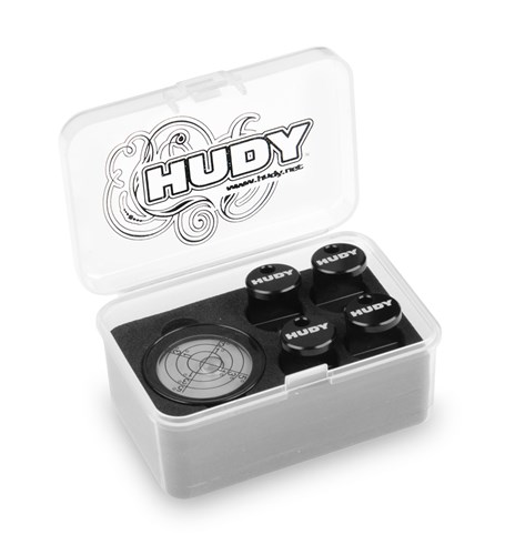 Justerbare føtter for set-up boardsFire høydejusterbare føtter for presis nivelleringIntegrert vater for rask kontrollØker nøyaktigheten ved chassis- og setupmålingerProdusert i aluminiumPasser HUDY set-up boards og andre 10mm brett