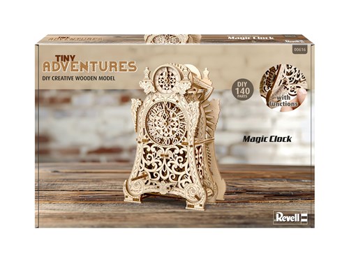 Tiny Adventures byggesett. Bygg din egen mekaniske klokke i tre - et byggesett hvor tannhjul, pendel og visere arbeider sammen i en synlig konstruksjon. Når modellen er ferdig, trekkes den opp med nøkkel og settes i bevegelse.