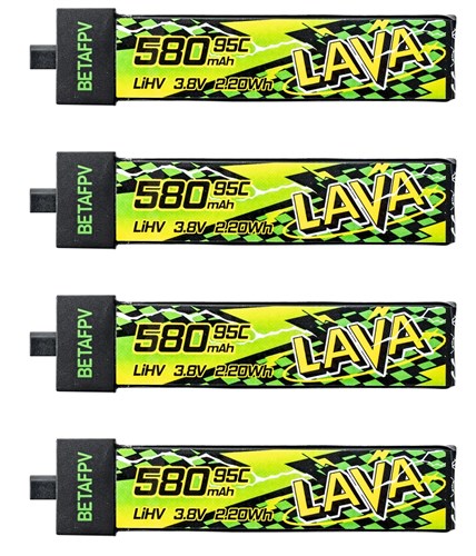 Pakke med 4 stk. 1s 580mAh - 95C - BETAFPV Lava II med BT 2.0-stik. Kompakt 1S-batteri designet til mikrodroner og whoop-droner. Med en afladningshastighed på 95C og forbedret kapacitet giver batteriet stabil strøm og ensartet ydeevne under hele flyvetiden. Disse batterier er HV-batterier og leveres med 3,8V.
