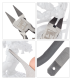 Skæret har et gummibelagt greb og en fjederbelastet mekanisme, der reducerer belastningen på hånden, mens formlinjeskraberen er designet til at nå ind i trange og detaljerede områder.