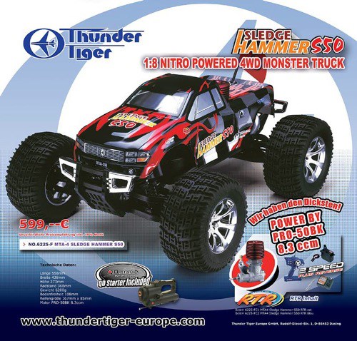 Den nye MTA-4 SledgeHammer setter en ny standard når det gjelder 4WD monstertruck, nå leveres også bilen med 2.4gHz radioutstyr!. Bilen leveres med PRO-50 motor med hele 8,2ccm, og enorme dekk for maksimal fremkommelighet. Bilen kommer RTR med 3 kanals radio, servoer ferdig montert, 2 gir fremover og revers. Bilen startes med den medfølgende elektriske starteren. (krever 7,2V pakke)Du trenger følgende utstyr: